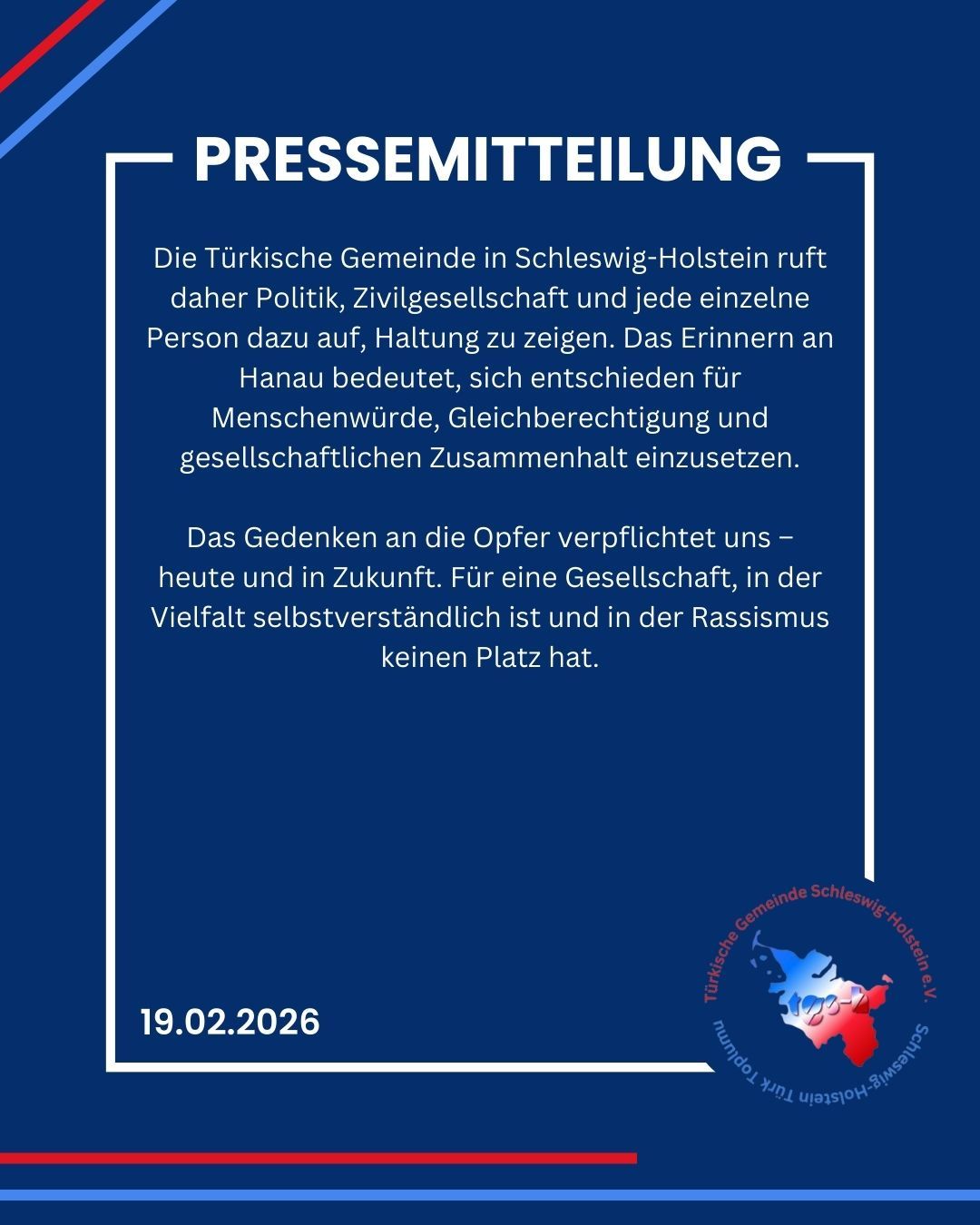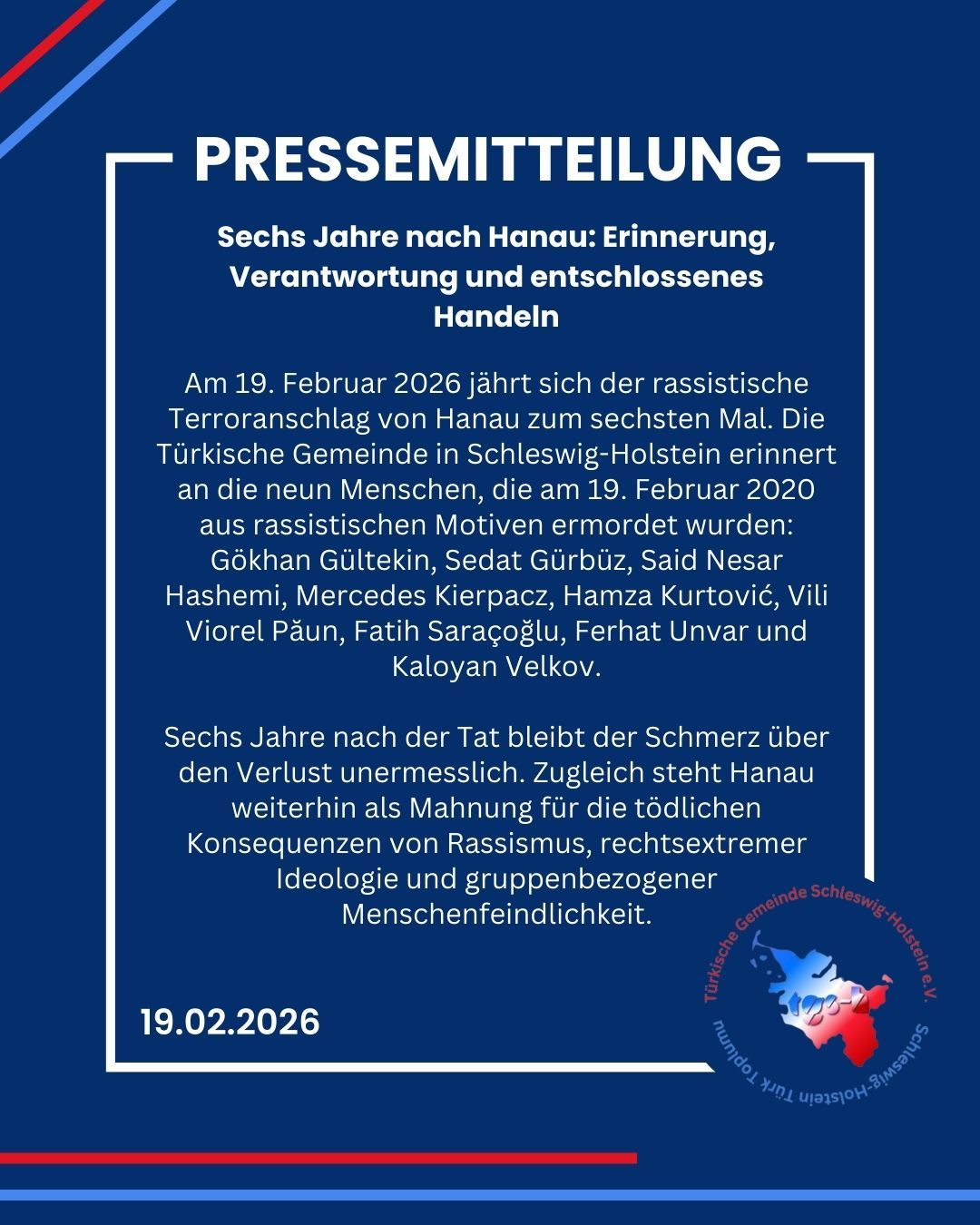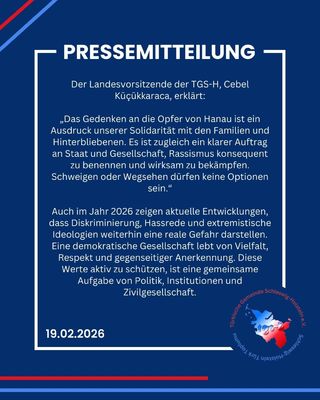 Am 19. Februar 2026 jährt sich der rassistische Terroranschlag von Hanau zum sechsten Mal. Die Türkische Gemeinde in Schleswig-Holstein erinnert an die neun Menschen, die am 19. Februar 2020 aus rassistischen Motiven ermordet wurden: Gökhan Gültekin, Sedat Gürbüz, Said Nesar Hashemi, Mercedes Kierpacz, Hamza Kurtović, Vili Viorel Păun, Fatih Saraçoğlu, Ferhat Unvar und Kaloyan Velkov.Sechs Jahre nach der Tat bleibt der Schmerz über den Verlust unermesslich. Zugleich steht Hanau weiterhin als Mahnung für die tödlichen Konsequenzen von Rassismus, rechtsextremer Ideologie und gruppenbezogener Menschenfeindlichkeit.