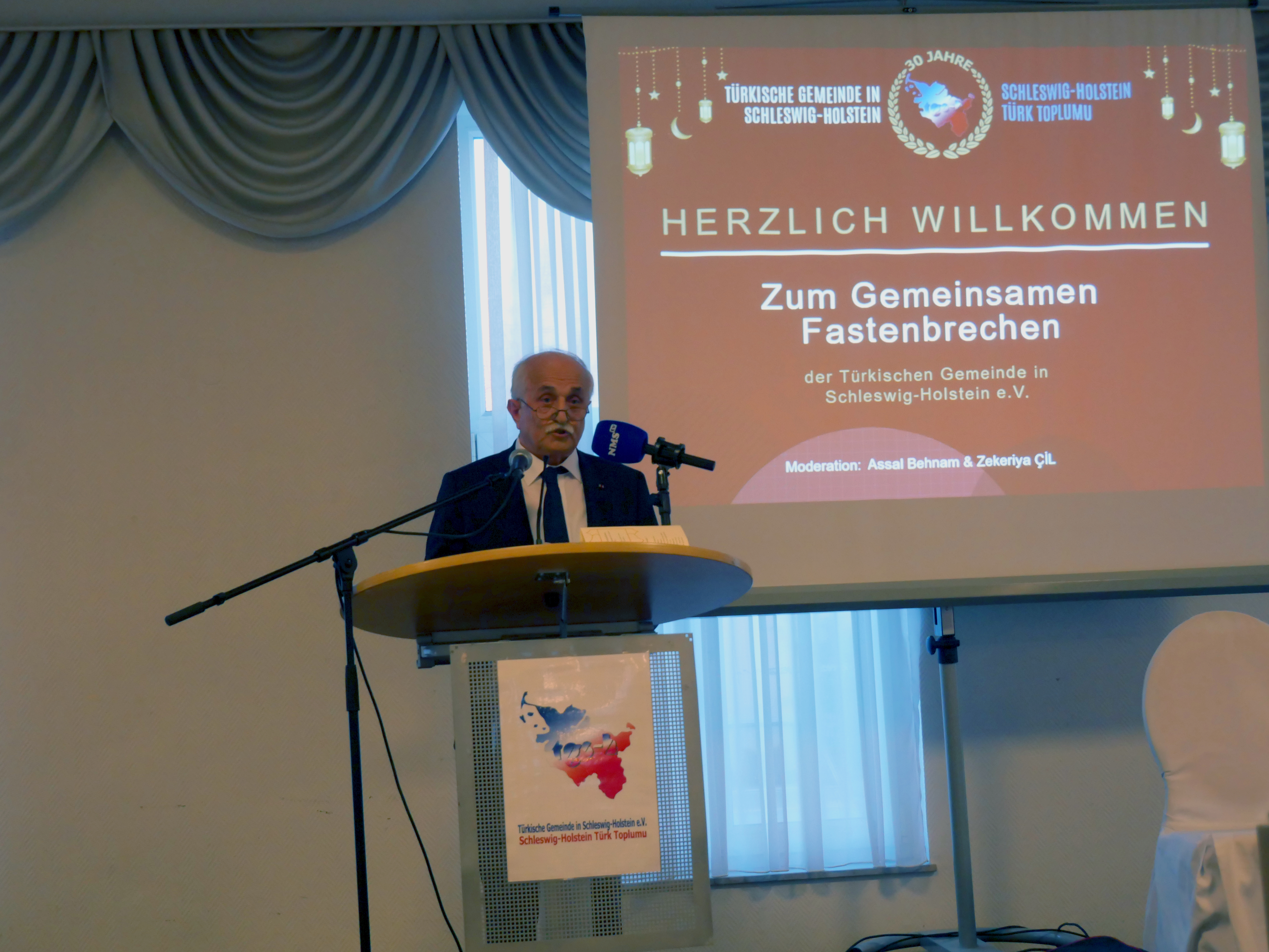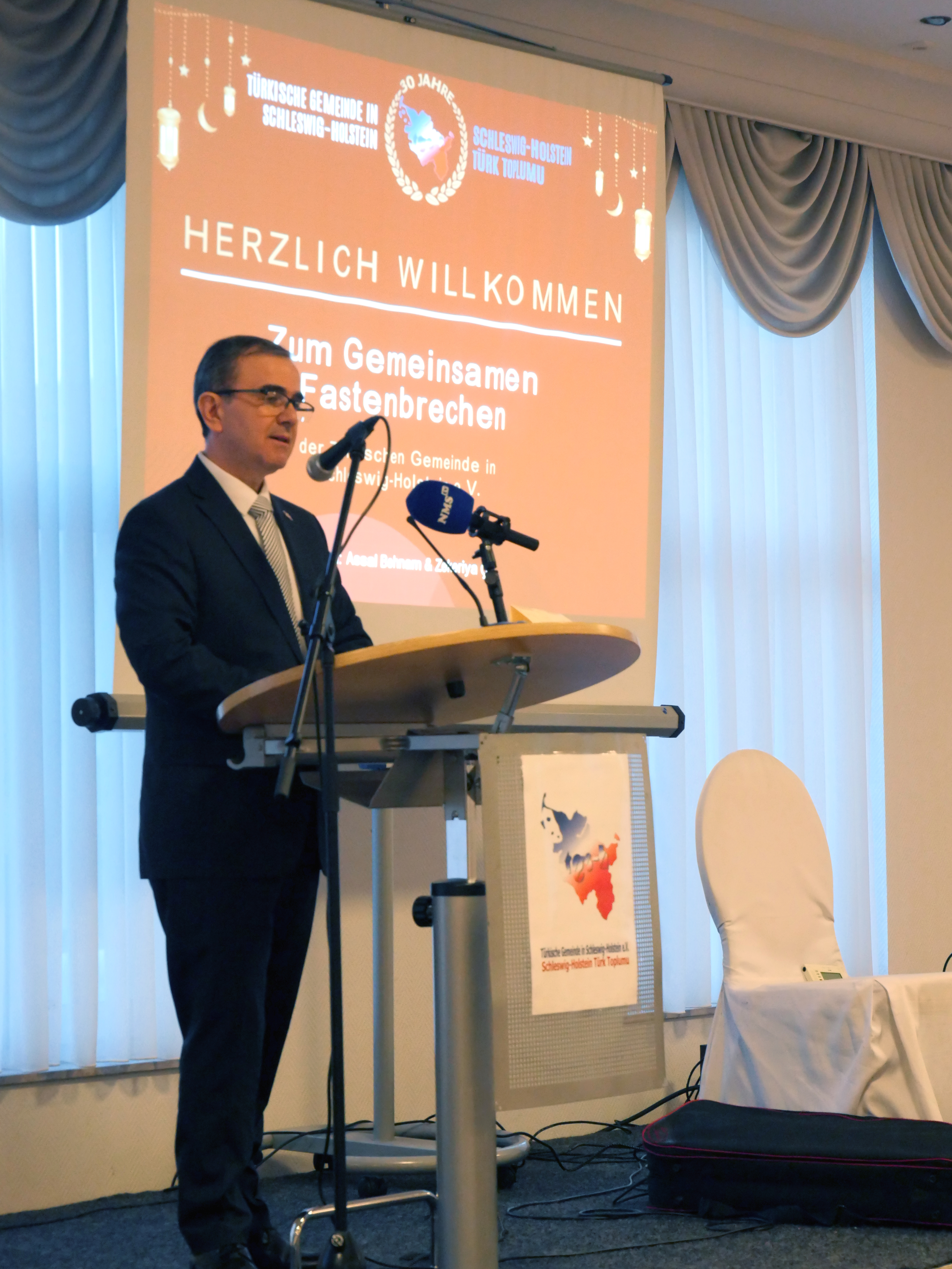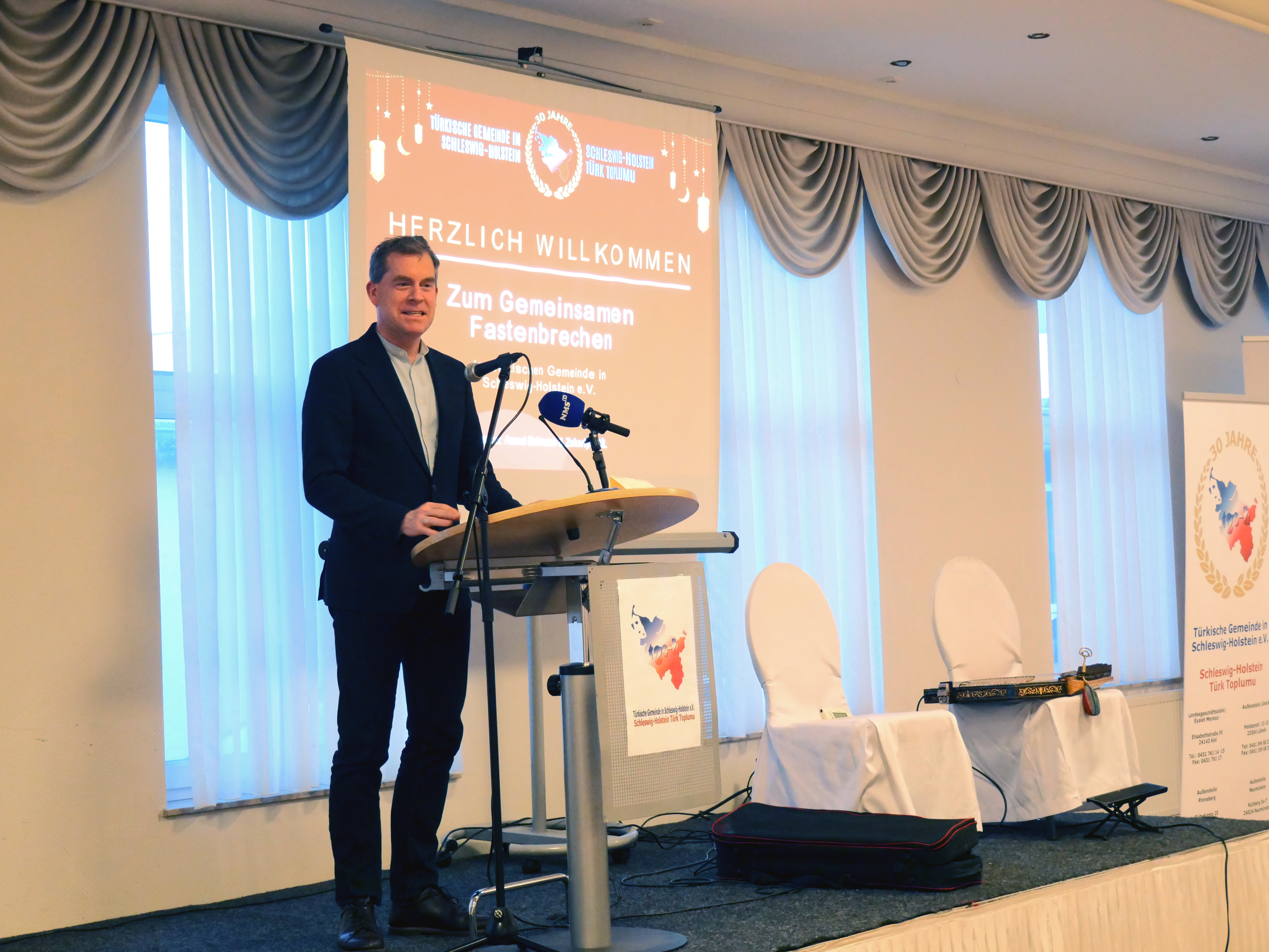 Auch der Kieler Oberbürgermeister Ulf Kämpfer sprach zu den Gästen. Er bemerkte, dass er in diesem Jahr zum letzten Mal als Oberbürgermeister am Iftar der TGSH teilnehme. In den vergangenen zwölf Jahren sei er – wann immer es ihm möglich gewesen sei – sehr gerne zu dieser Veranstaltung gekommen. Gerade in einer Zeit, in der es in vielen Teilen der Welt Konflikte und Unsicherheit gebe, sei er dankbar, hier in einer Gemeinschaft zusammenzukommen, in der Menschen guten Willens und guten Herzens miteinander begegneten. Zugleich dankte er der TGSH für die zahlreichen Begegnungen und Gespräche in den vergangenen Jahren. Mit Blick auf die Zukunft betonte Kämpfer zudem, dass die Wahl von Samet Yilmaz zum ersten muslimischen Oberbürgermeister der Stadt Kiel ein starkes Zeichen für die Weltoffenheit der Landeshauptstadt sei.