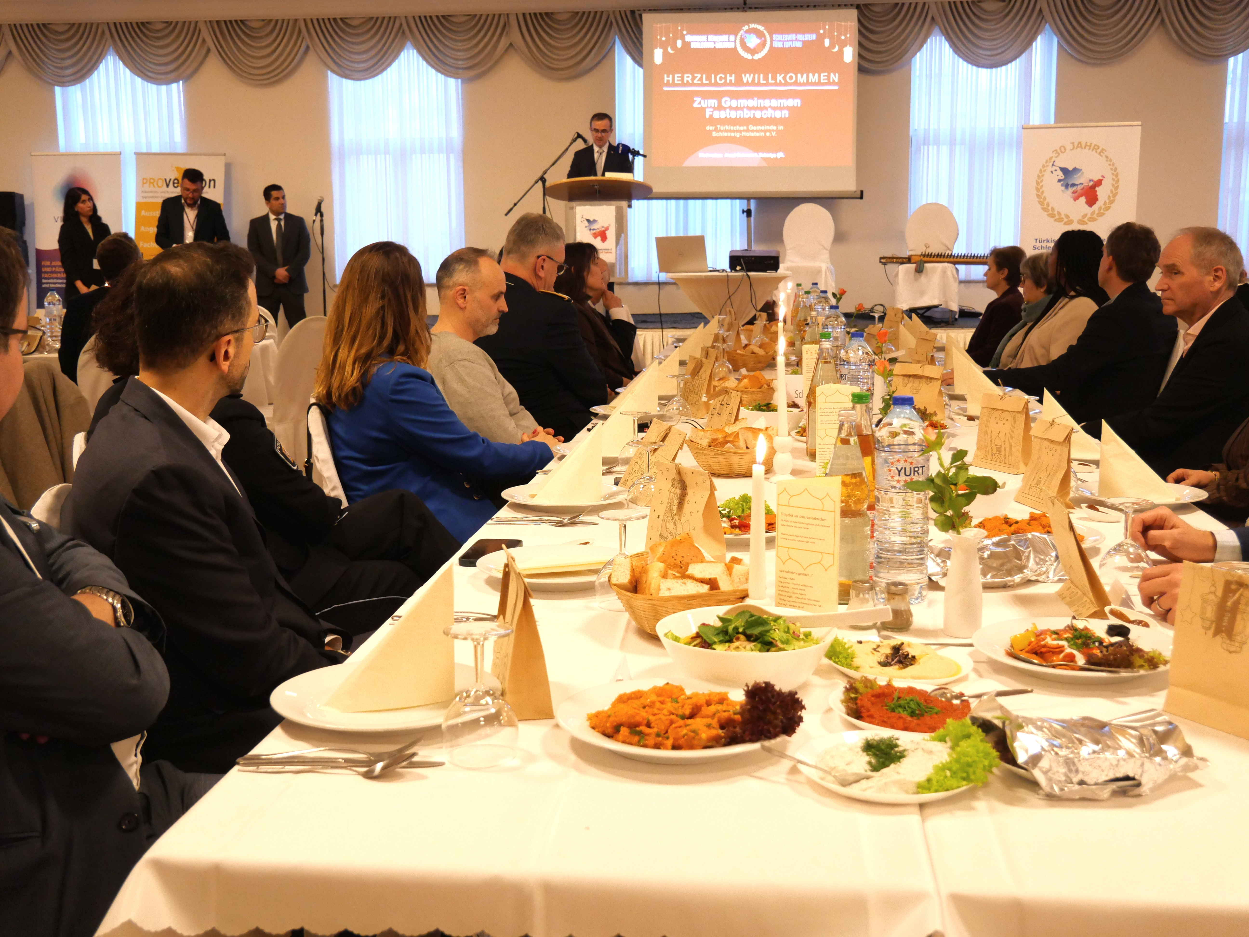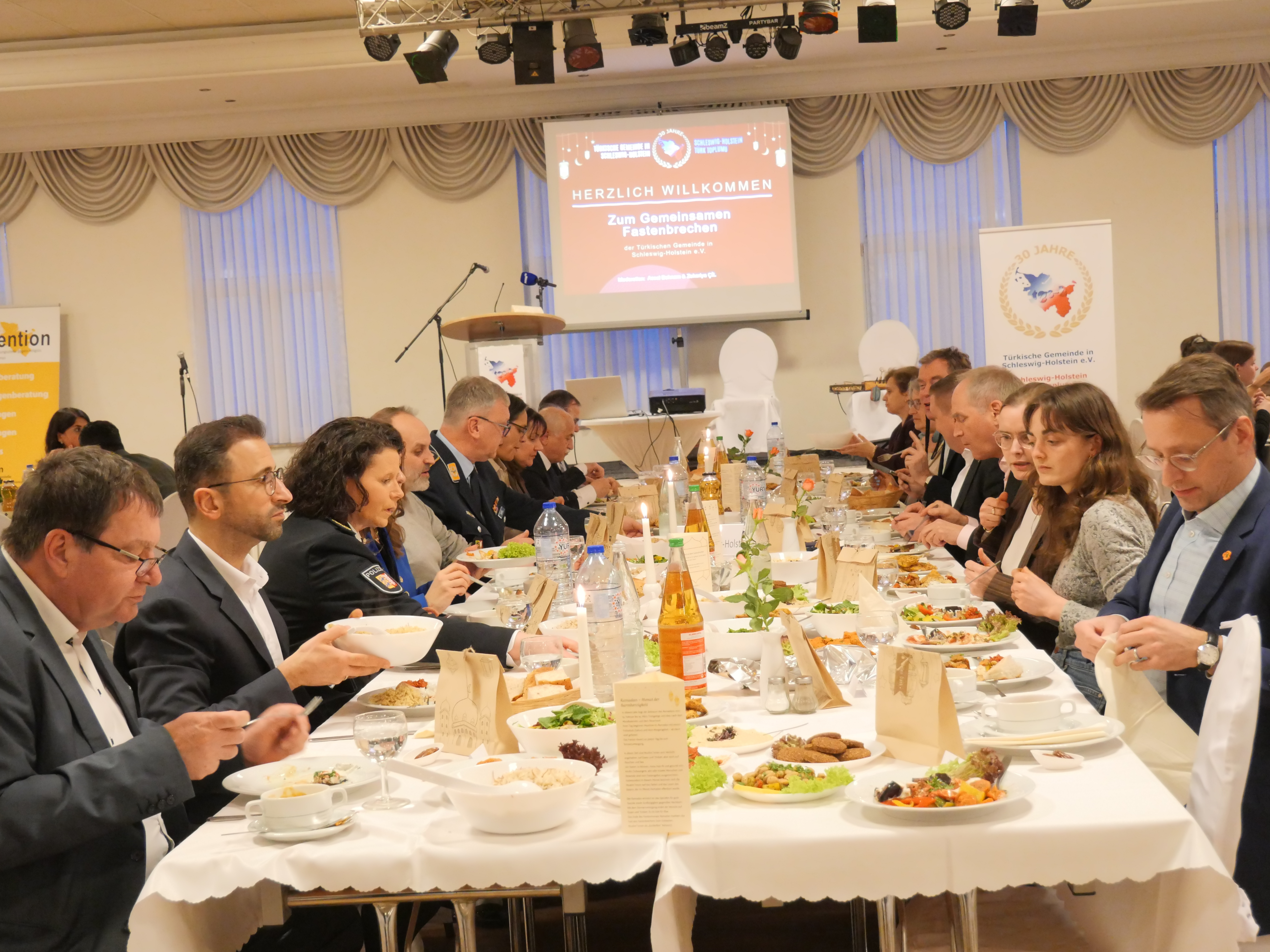 Das diesjährige Fastenbrechen der Türkische Gemeinde in Schleswig-Holstein e.V. fand im Mega Saray Eventcenter in Kiel-Gaarden statt und stand ganz im Zeichen des Miteinanders. Zahlreiche Vertreterinnen und Vertreter aus Politik, Verwaltung, Sicherheitsbehörden, Religionsgemeinschaften und Zivilgesellschaft folgten der Einladung – und setzten damit ein sichtbares Zeichen für Dialog, Respekt und demokratischen Zusammenhalt in Schleswig-Holstein.Im Anschluss begrüßte Dr. Cebel Küçükkaraca die Gäste und hob in seiner Rede hervor, dass der Ramadan in diesem Jahr nahezu zeitgleich mit der christlichen Fastenzeit stattfindet. Trotz unterschiedlicher religiöser Ausdrucksformen sei der innere Kern vergleichbar: Es gehe um Selbstreflexion, um Verantwortung, um Solidarität mit den Schwächeren und um die bewusste Auseinandersetzung mit dem eigenen Handeln.