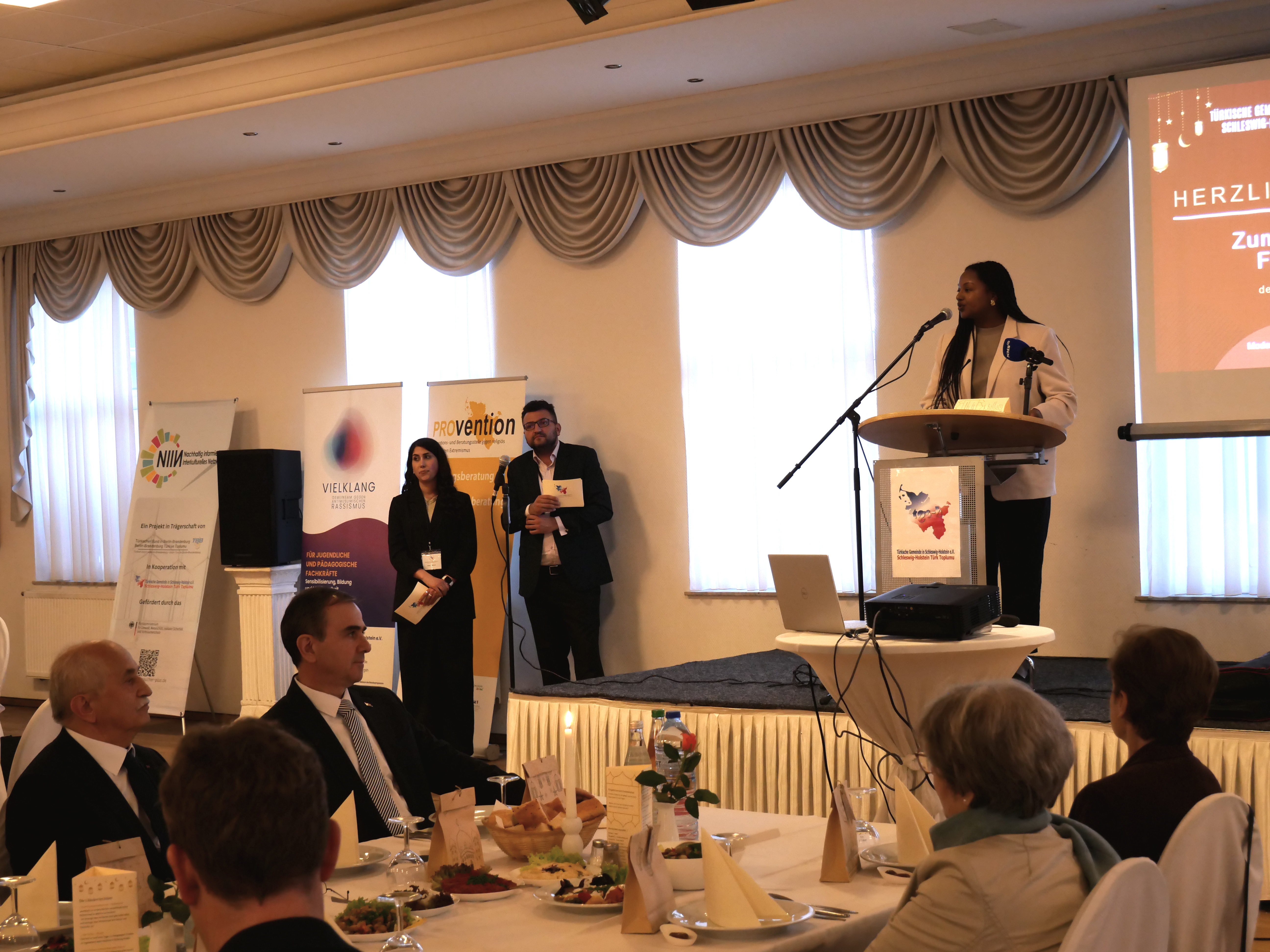 Zu den Ehrengästen des Abends gehörte unter anderem die stellvertretende Ministerpräsidentin Aminata Touré. In ihrem Grußwort betonte sie, dass sie immer wieder gern am Fastenbrechen der TGSH teilnehme. Sie überbrachte zugleich die Entschuldigung des Ministerpräsidenten, der sein Kommen ursprünglich vorgesehen hatte und sein Fernbleiben aufrichtig bedauere.